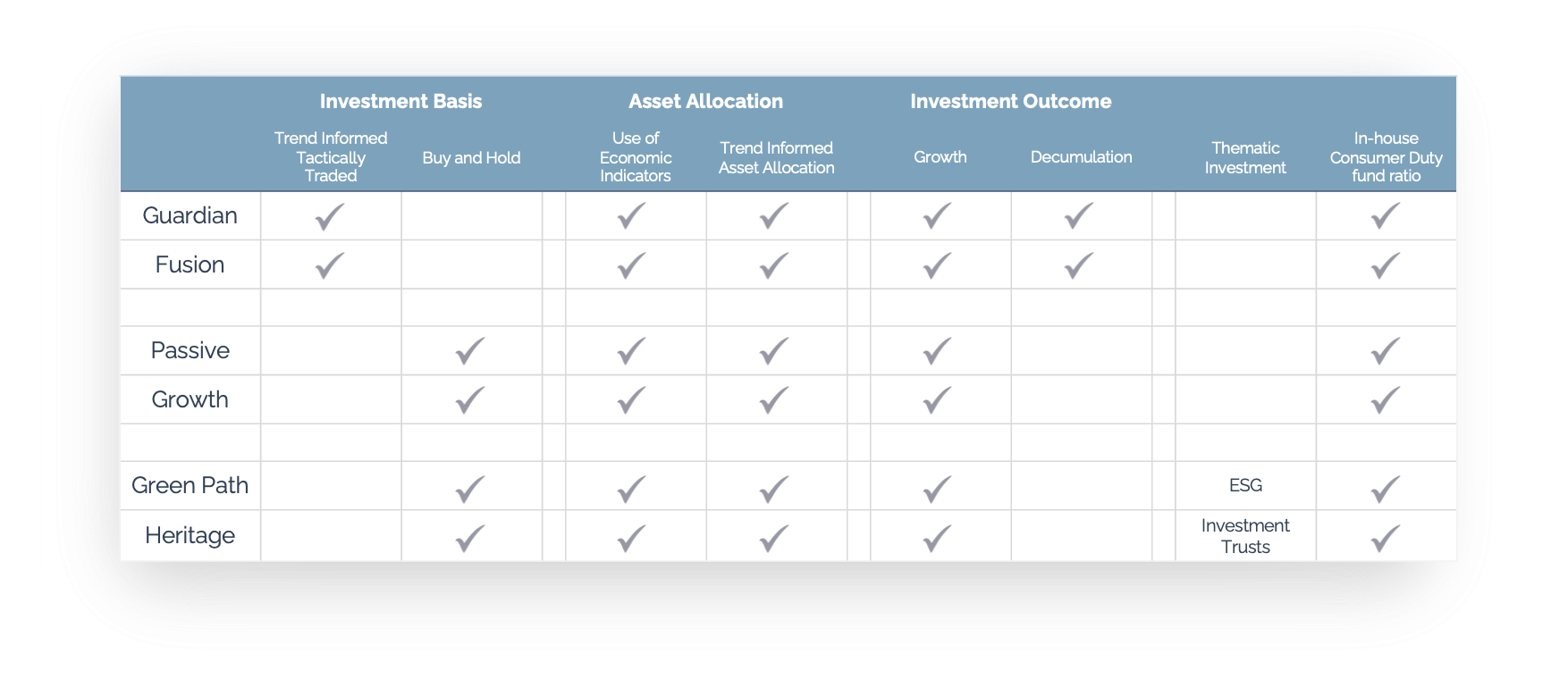 We offer a range of risk adjusted managed portfolio service investments. Each strategy has been created to provide an investment solution for the many different types of investors with differing risk levels and investment needs.